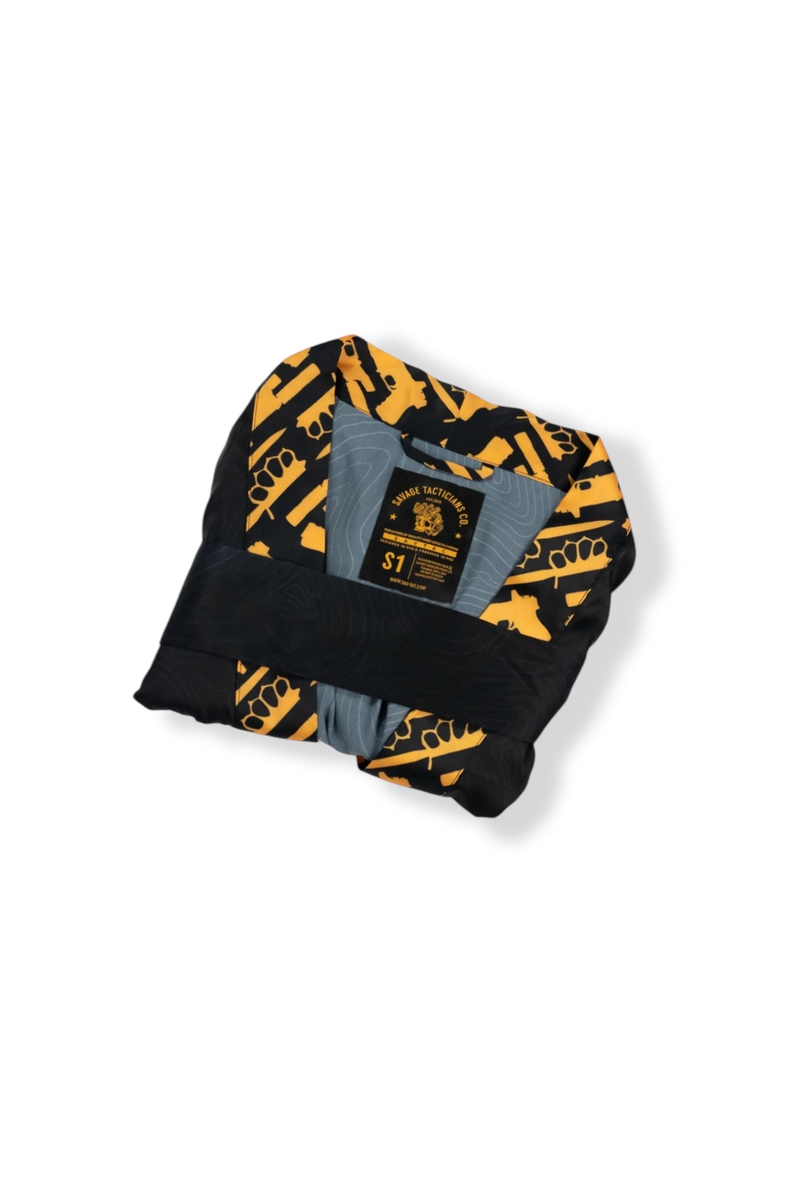 Perfect for lounging at home, poolside, or casual Fridays at work, this ultra-soft silky robe is your reliable choice. Featuring a topography print on the main body and sleeves, the trim is accented with canned glocks and a WW1 trench knife. Crafted from extremely soft silk-like Satin Atlas and Polyester, it includes a removable waist tie with belt loops for a secure fit.